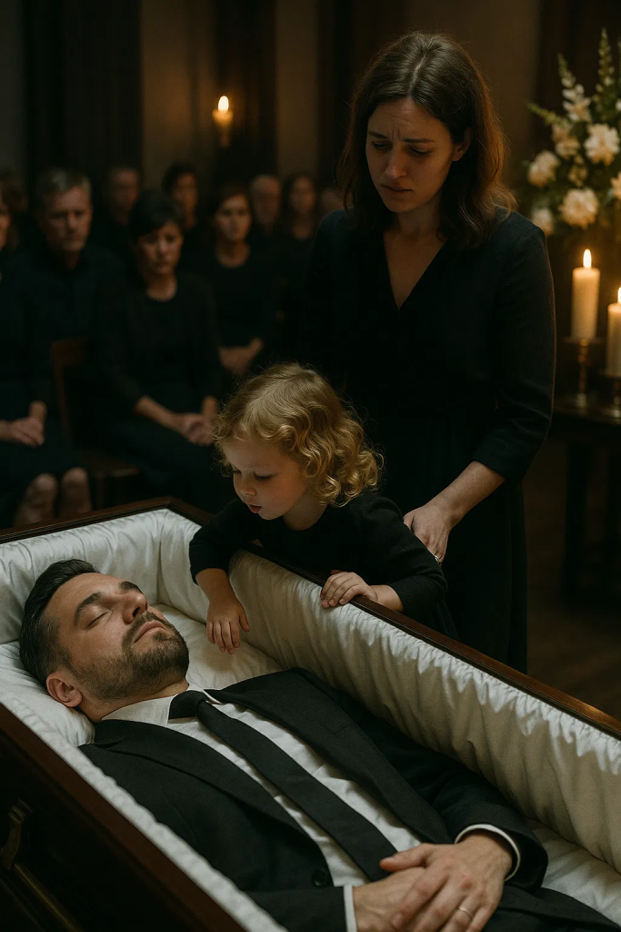 Una amiga de la familia levantó con cuidado a Lily para que pudiera ver el interior del ataúd. Sus manitas se aferraron al borde del féretro mientras observaba el rostro de su padre. Le temblaban ligeramente los labios. Al principio, guardó silencio. Luego, su vocecita llenó el aire, rompiendo el frágil silencio como un cristal roto.