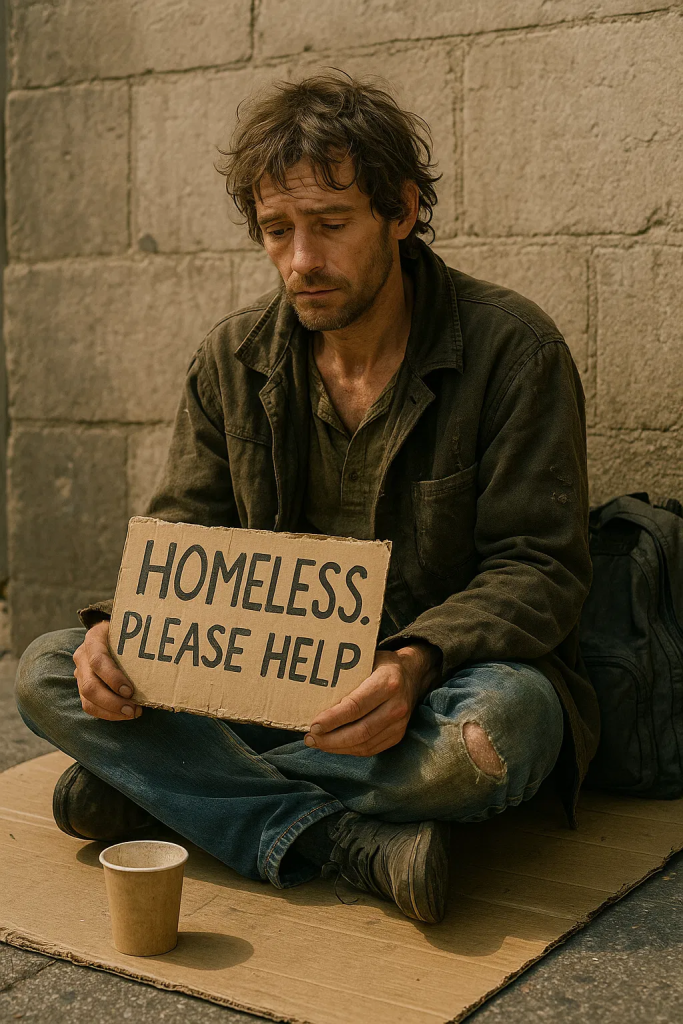 Un hombre sin hogar estaba desplomado en el pavimento, con el cabello desordenado y la ropa deshilachada.