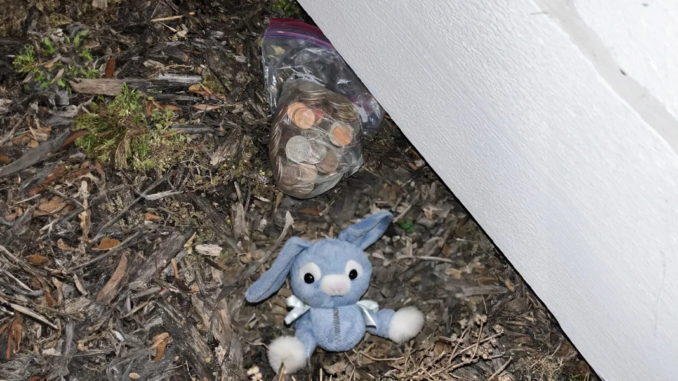 Una bolsa de plástico con monedas y un pequeño conejito de peluche bajo una valla en un patio | Fuente: Midjourney