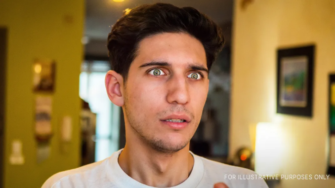Primer plano de un hombre moreno, barbudo, atractivo, divertido y confundido, con camiseta rosa, esperando noticias, mordiéndose el labio, aislado sobre un fondo violeta, morado y lila pastel. Fuente: Getty Images.