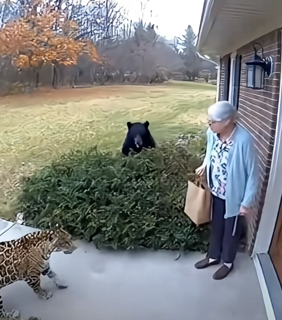 La grabación muestra a la anciana de pie en su porche, sobresaltada al ver a un jaguar salvaje acercarse repentinamente a su casa. Justo cuando el depredador parecía listo para atacar, un oso negro emergió de los arbustos cercanos, colocándose entre la abuela y el gran felino.