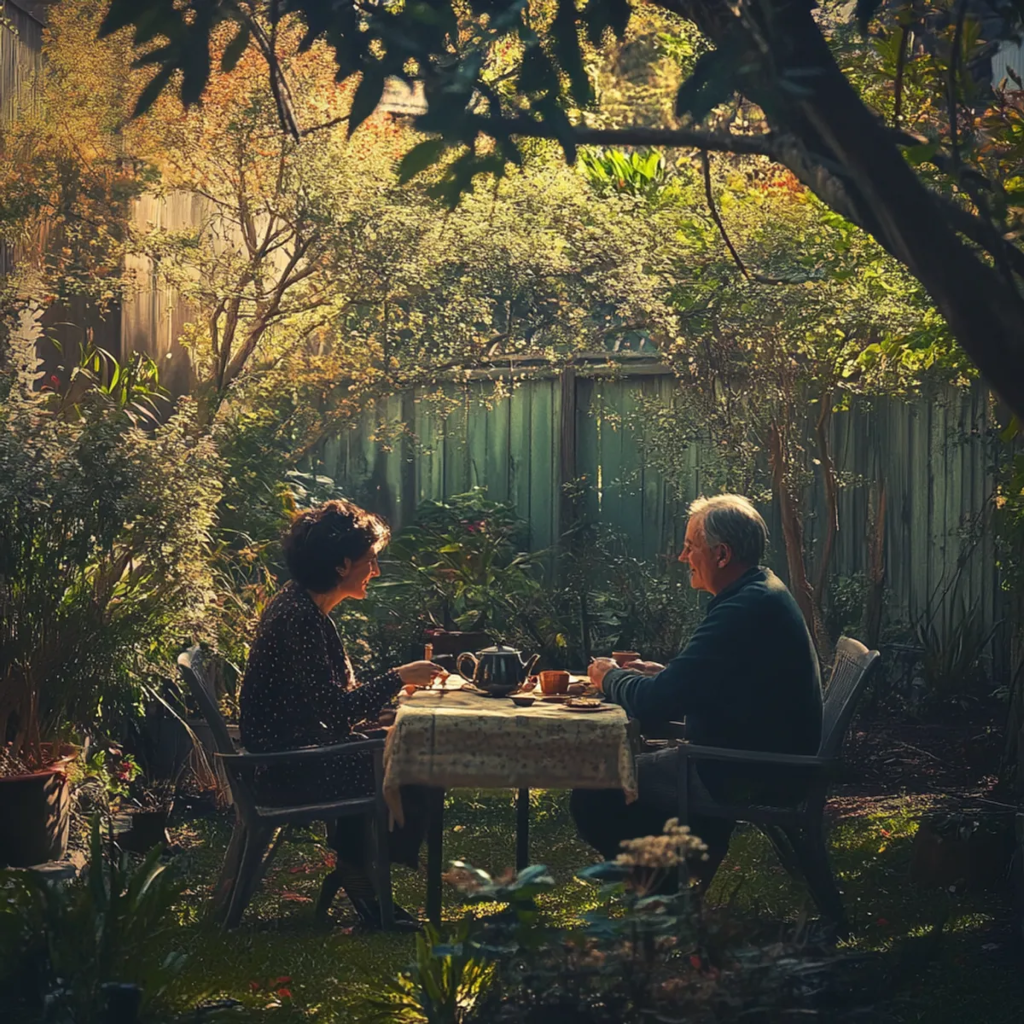 Pareja de ancianos tomando el té en su patio trasero | Fuente: Midjourney