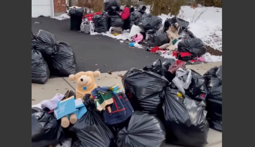 Las pertenencias de una persona tiradas en bolsas de basura fuera de una casa | Fuente: Midjourney