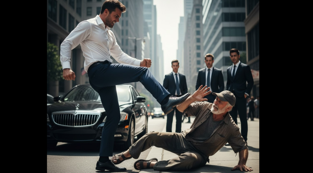 “Estás bloqueando la calle”, espetó, ajustándose el cuello de la camisa como si nada hubiera pasado. El anciano en el suelo gimió. Su bastón rodó a un lado de la carretera. Un par de jóvenes rieron. Otros grabaron la escena con sus celulares. Una mujer exclamó: “¡Qué falta de respeto!”. Pero nadie se atrevió a confrontarlo.