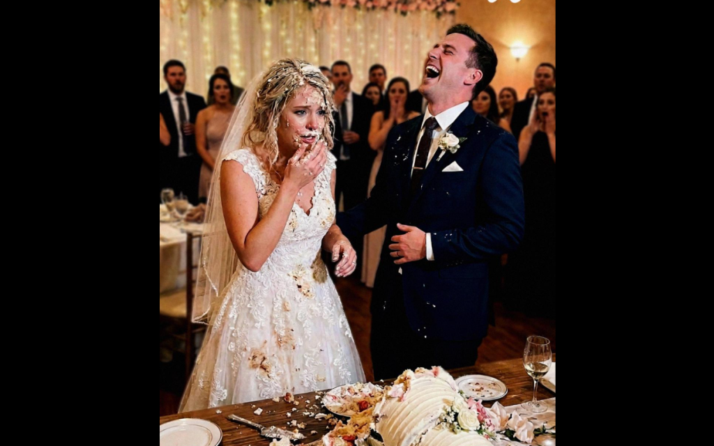 Hicimos el corte juntos, y yo estaba alcanzando el servidor cuando Ed de repente agarró la parte de atrás de mi cabeza y empujó toda mi cara directamente hacia el pastel.