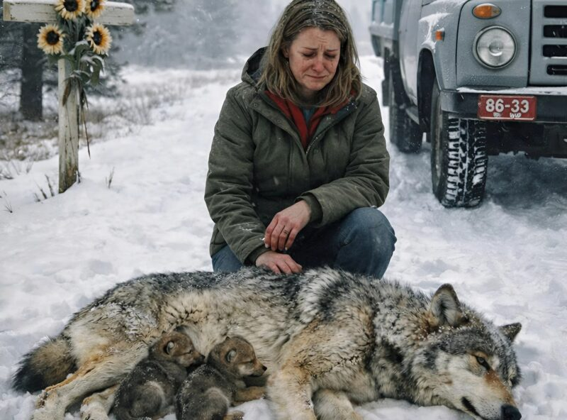La mujer detuvo el coche y salió. Al acercarse, se dio cuenta con horror de que una loba yacía allí. El animal estaba paralizado, exhausto, y apretados contra ella había dos pequeños cachorros de lobo. Los cachorros gemían, temblando de frío y miedo, como si le rogaran a su madre que se levantara.