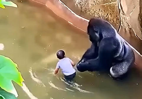 El 28 de mayo de 2016, un niño pequeño logró sortear las barreras y cayó dentro del recinto de los gorilas. Harambe, que pesaba más de 180 kilos, se acercó al niño. Las imágenes de video muestran momentos de interacción, algunos aparentemente tranquilos, otros más preocupantes, mientras el gorila transportaba al niño por aguas poco profundas.