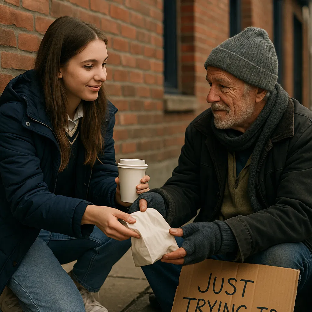 Todo empezó una tarde fría de principios de marzo. Mientras caminaba hacia la parada del autobús, me encontré con un hombre sentado contra una pared de ladrillos cerca de la panadería de la esquina. Llevaba la ropa gastada y desparejada. Tenía las manos rojas de frío. Un cartel de cartón reposaba frente a él. Decía: