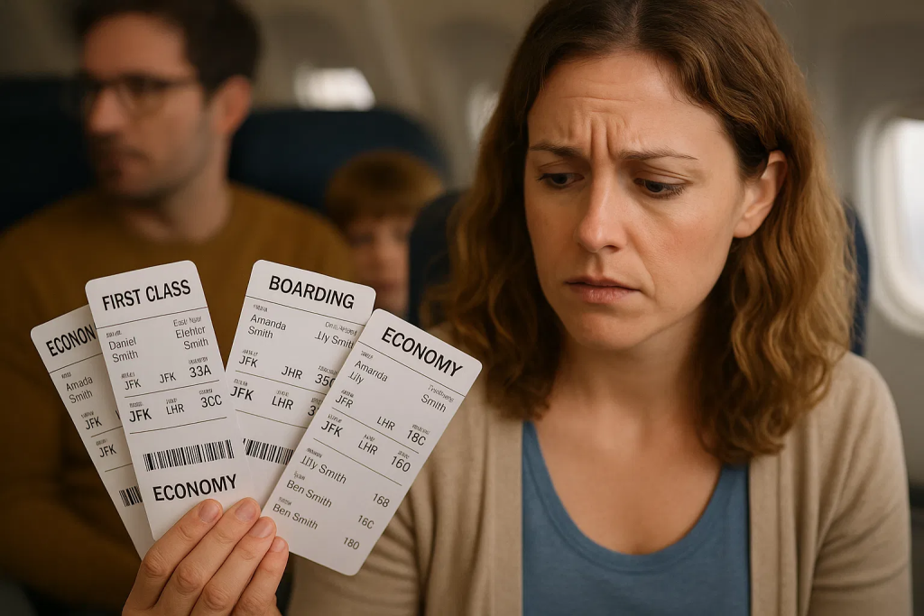 Un asiento en primera clase… para Daniel. Uno para su madre, Eleanor. Tres billetes en clase turista… para mí y los niños.