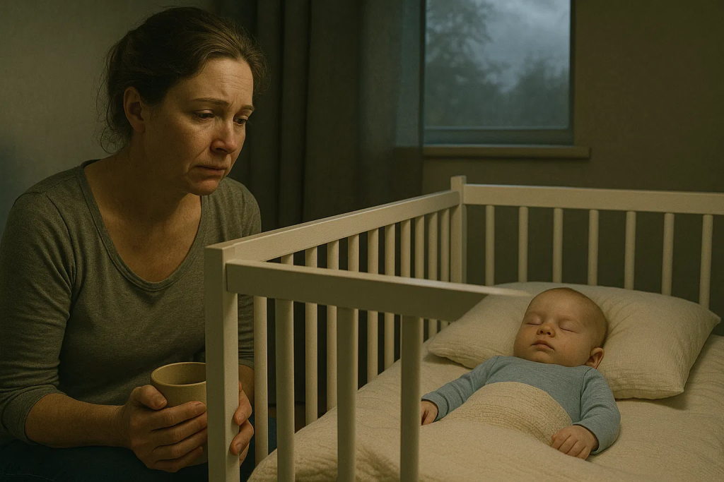 Sarah Parker estaba sentada en la puerta de la habitación de los niños, con las manos apretadas alrededor de una taza de té desportillada que hacía tiempo que se había enfriado. Miraba fijamente la cuna, con la mirada fija, el pecho subiendo y bajando con respiraciones superficiales.